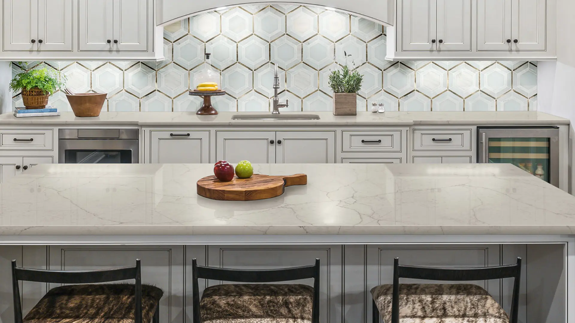 Strength. Quartz counters are made by combining 93% natural quartz stone with 7% resin binder and pigment. This creates an extremely hard stone that is stronger than granite or marble. The slab is the same working thickness as other materials.